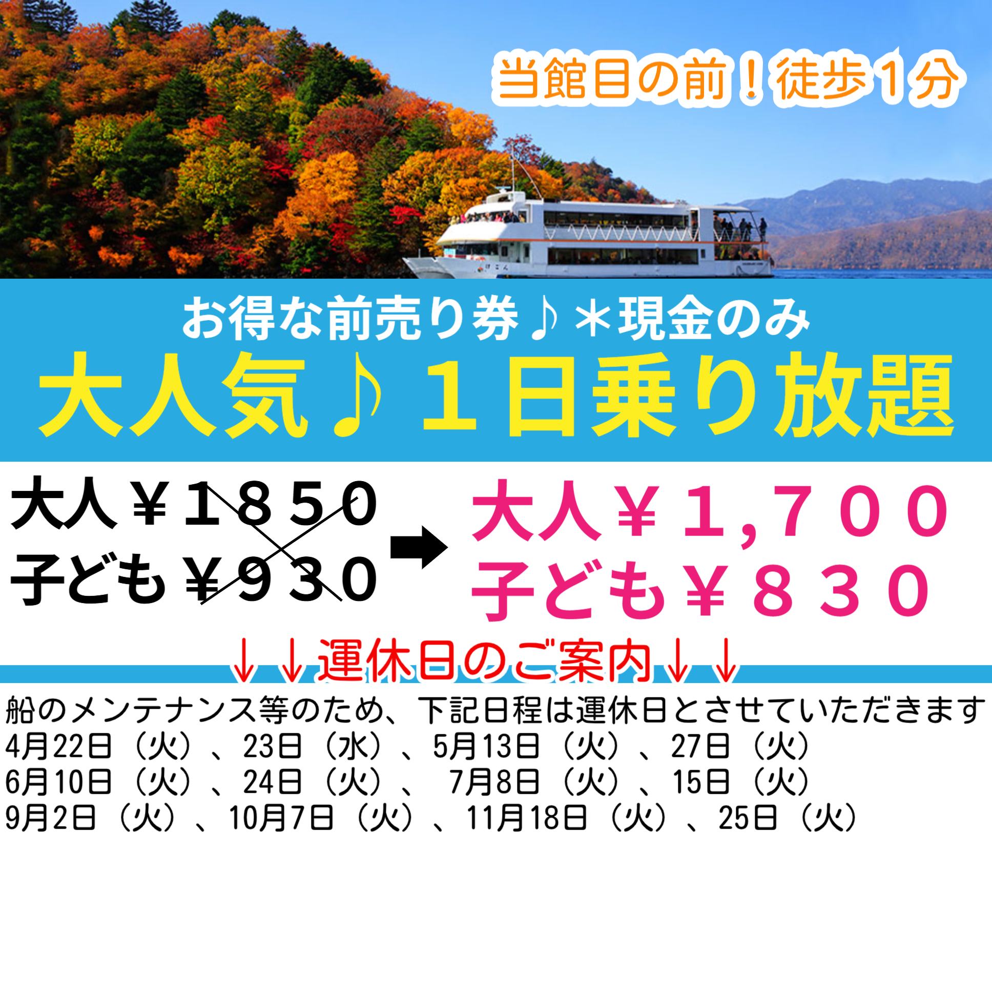 Home › 遊覧船チケット 2025-05-12 遊覧船チケット 関連記事 全室レイクビュー!【冬季期間限定!ホームページよりお電話限定】ご自宅送迎付きプランの受付開始について 紅葉も残り2日~3日ほどで終わるそうです。 本日は旅籠なごみの客室ツアーです! 旅籠なごみ館内にある【Cafe&Bar SHIRANE】が再度営業を開始いたしました! 奥日光の現在の魅力を発信します! 当館より徒歩1分にある大人気! 中禅寺湖遊覧船がシーズンを迎えました!